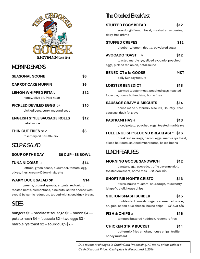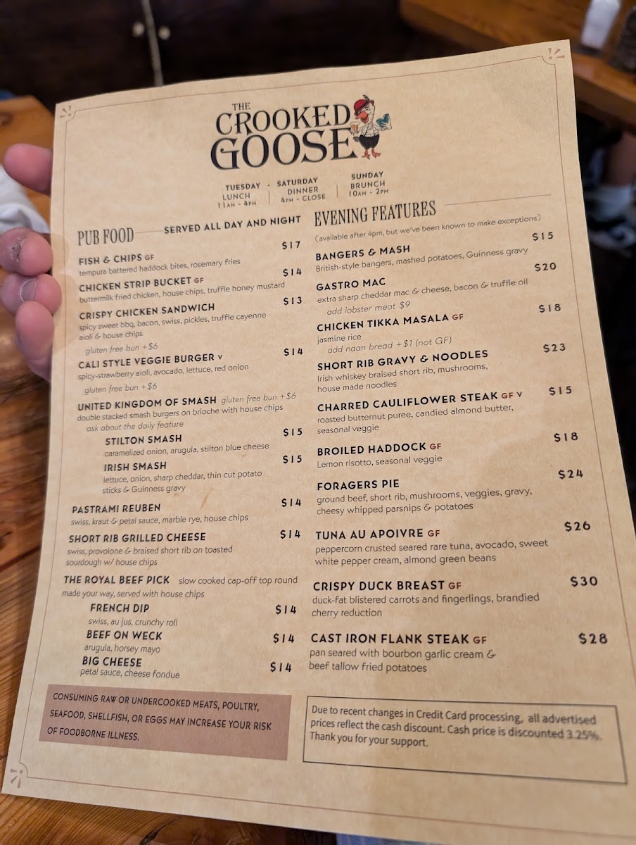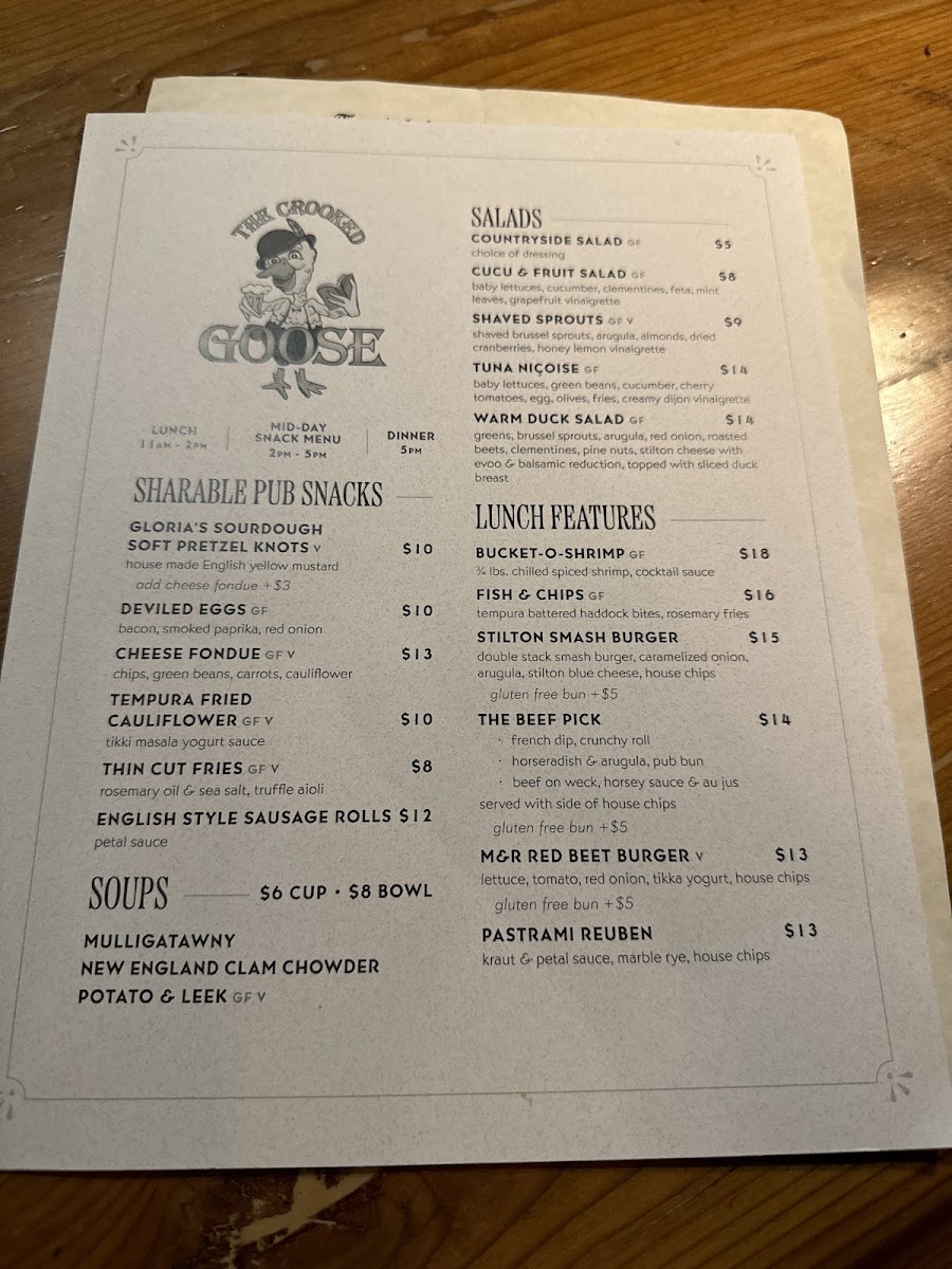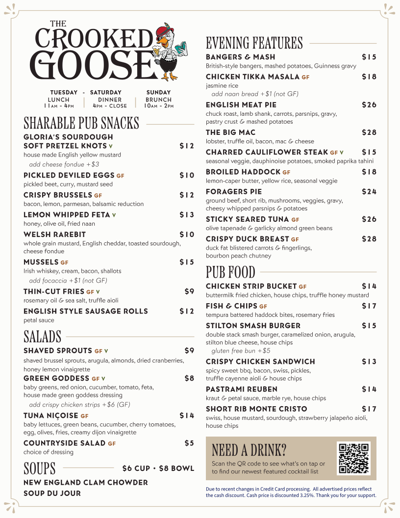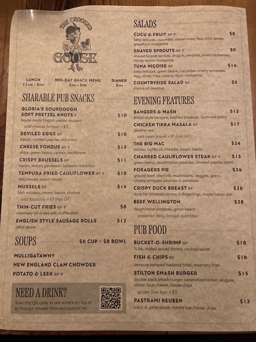 For those seeking lighter fare, the Duck Salad shines with its fresh ingredients and flavorful garnishes, celebrating culinary creativity. Whether you prefer gluten-free meals or mouthwatering vegetarian options, The Crooked Goose caters to all.