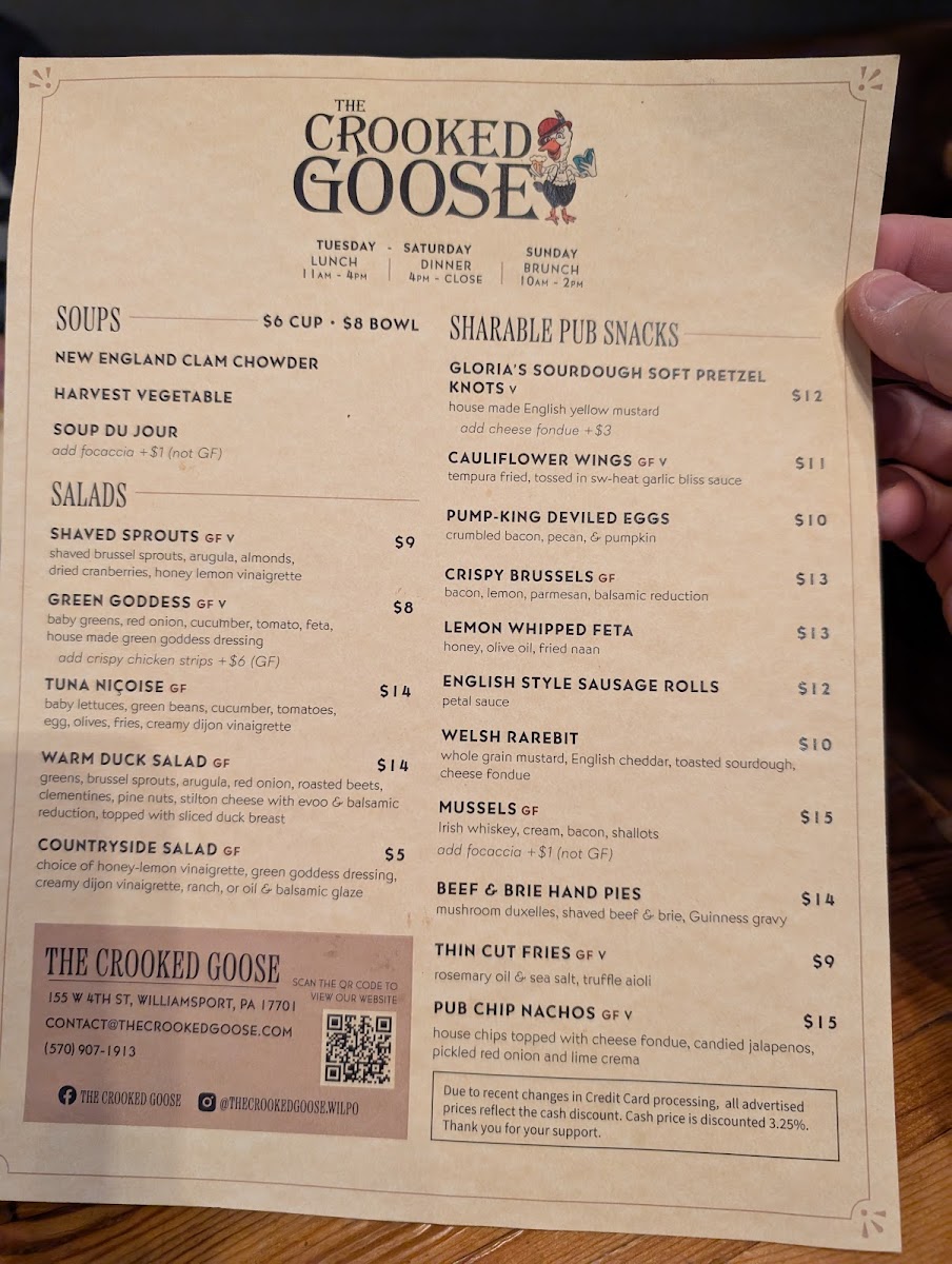 Welcome to The Crooked Goose, a delightful fusion of English pub charm and American comfort food located at 155 W 4th St, Williamsport, PA. The moment you step inside, you're enveloped by a cozy atmosphere adorned with charming decor, creating the perfect backdrop for a meal with friends.